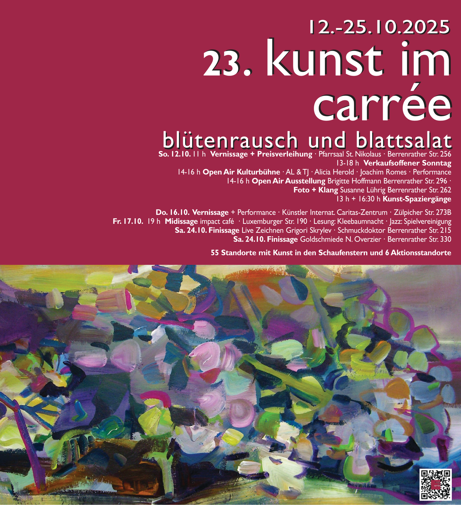 Die Kunstmeile kunst im carrée 12.10.-25.10. lädt dieses Jahr zum Flanieren und zum Betrachten der mehr als 55 Galeriefenster ein, in denen Werke zum künstlerischen Motto "Blütenrausch und Blattsalat" präsentiert werden. Die Open-Air Kulturbühne überrascht mit einer Reihe von experimentellen Programmpunkten in Zusammenarbeit mit Musikern und Literaten. Kinder-Mitmach-Aktionen, Lesungen und Konzerte laden zum aktiven Mitmachen und zum Diskurs oder zum Hörerlebnis ein. Es erwarten dich literarische Kunst-Spaziergänge, die dich an vielen Kunststandorten vorbeiführen, sowie ein verkaufsoffener Sonntag am 12.10. 13-18 Uhr.
