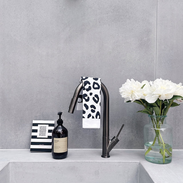 Das weiße Geschirrtuch aus 50 % Baumwolle, 50% Leinen mit coolem schwarzen Leo-Print von LOU LOTO. ist ein MUSS in jeder Küche. Dezente Farben mit Motiven, die gute Laune machen. Bei 40° in der Waschmaschine waschbar.