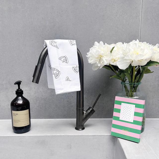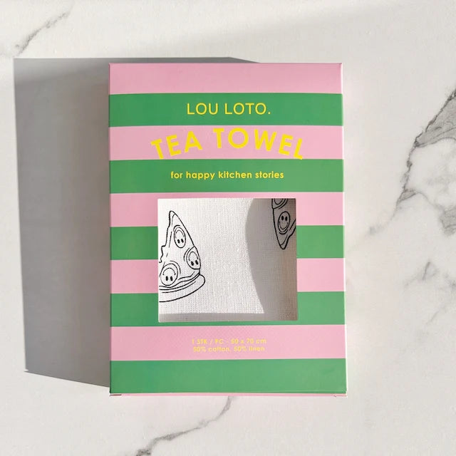 Das weiße Geschirrtuch aus 50 % Baumwolle, 50% Leinen mit coolem Pizza-Print von LOU LOTO. ist ein MUSS in jeder Küche. Dezente Farben mit Motiven, die gute Laune machen. Bei 40° in der Waschmaschine waschbar.