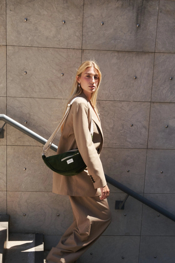 Die kompakte und dennoch geräumige Halbmondtasche Iria von Recitem aus weichem aber sehr robustem Stoff aus der Möbelindustrie ist ein absolutes Must Have! Sie hat die perfekte Größe, um deine alltäglichen Bedarfsgegenstände zu verstauen und sogar eine kleine Trinkflasche oder Regenschirm zu transportieren. Die zwei Außentaschen mit Reißverschluss sowohl vorne als auch hinten bieten zusätzlich separaten, geschützten Stauraum. Der bis zu 105cm verstellbare Schulterriemen ist bequem zu tragen und die Taschenform schmiegt sich perfekt an deine Körperform an. Die Taschen werden nachhaltig und mit möglichst wenig Materialverschwendung in Portugal per Hand hergestellt.