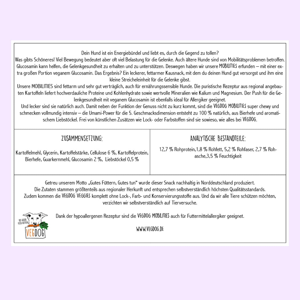 Dein Hund ist ein Energiebündel und liebt es, durch die Gegend zu tollen? Was gibts Schöneres! Viel Bewegung bedeutet aber oft viel Belastung für die Gelenke. Auch ältere Hunde sind von Mobilitätsproblemen betroffen. Glucosamin kann helfen, die Gelenkgesundheit zu erhalten und zu unterstützen. Deswegen VEGDOG die MOBILITIES MINIS erfunden – mit einer extra großen Portion veganem Glucosamin. Das Ergebnis? Ein leckerer, fettarmer Snack, der für eine gesunde Belohnung zwischendurch sorgt oder das Hundetraining auf gesunde Art versüßt!
