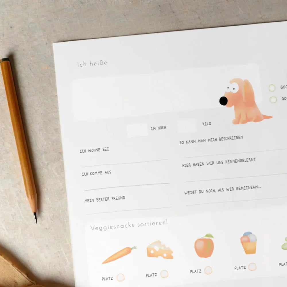 Hier können sich 15 Fellfreunde deines Vierbeiners verewigen. Alle Seiten sind speziell auf die pelzigen Begleiter abgestimmt und mit Fragen nach ihren Eigenheiten, Vorlieben, Ängsten und Abenteuern bestückt.