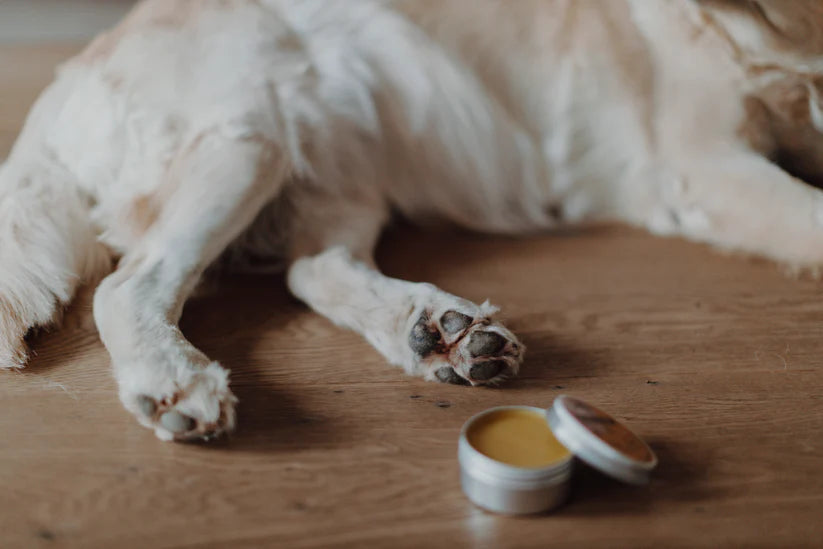 Eine kleine Menge Balsam aus der Dose nehmen und vorsichtig in die Pfoten einmassieren.