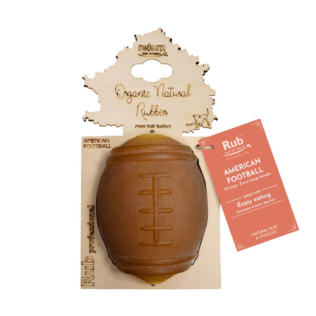 Der Rub American Football von POCURULL SL (Retorn) besteht aus 100% natürlichem und geruchsneutralem Bio-Harz ohne Farbstoffe. Er kann bei Bedarf mit Hundesnacks befüllt werden und schwimmt auch auf dem Wasser. Das Material ist soft aber dennoch robust und absolut unbedenklich für die Zähne und die Gesundheit des Hundes. Ideal als Jagd- und Fangspielzeug.
