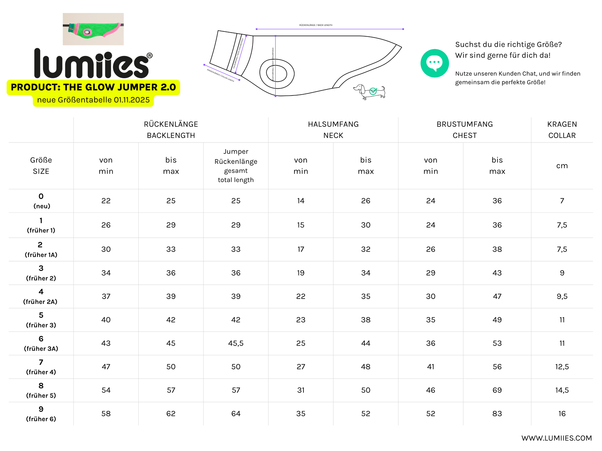 Der beliebte Glow Jumper von lumiies® wurde weiterentwickelt! Ab sofort gibt es ihn in 10 Größen – von 0 bis 9 (früher Größe 1–6) und damit auch für extra kleine Hunde wie Chihuahua & Co. Der Glow Jumper 2.0 ist noch weicher, anschmiegsamer und perfektioniert bis ins Detail.