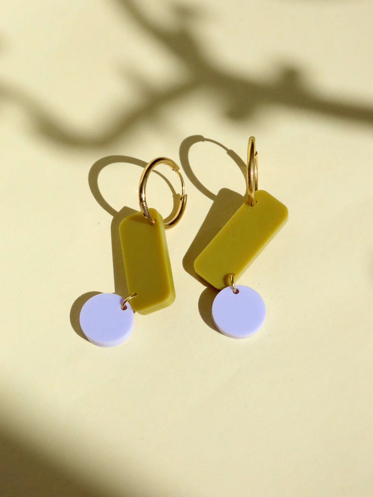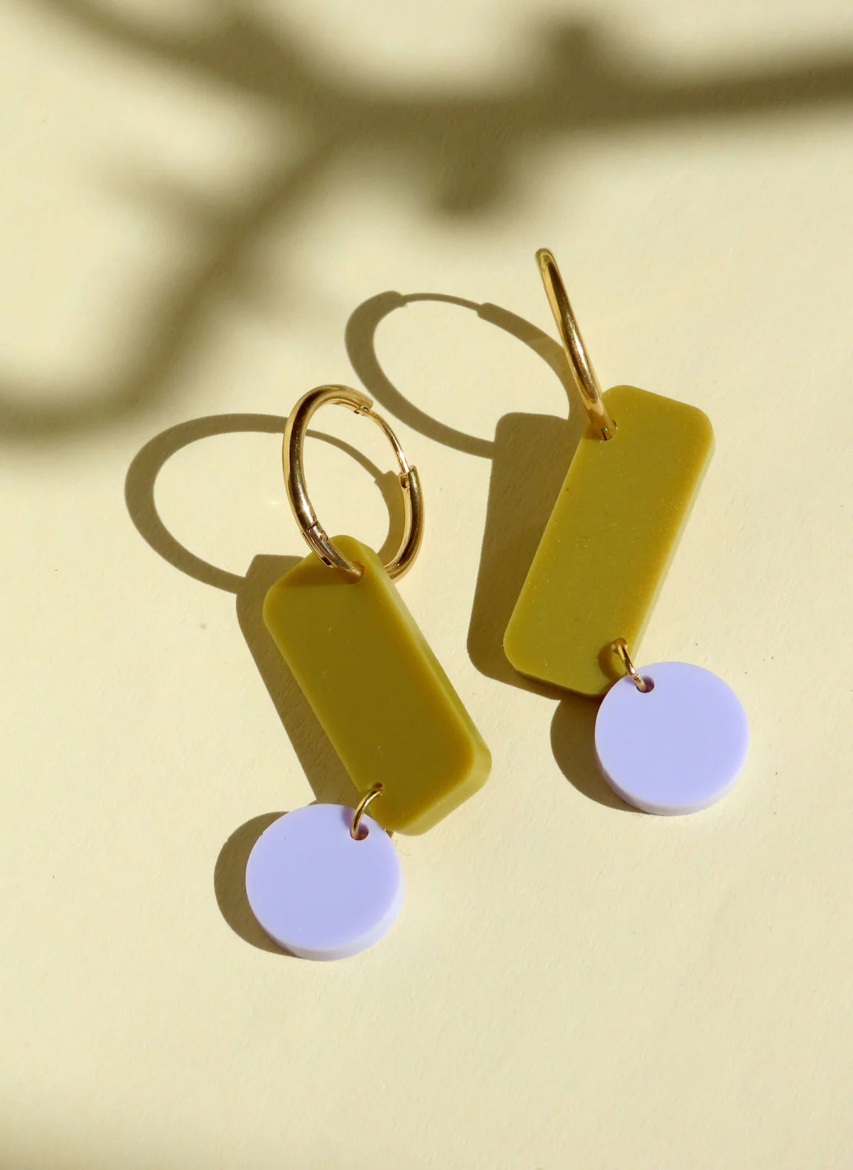 Diese Creolen sind ein echter Blickfang. Die geometrische Kombination aus länglichem Rechteck in Avocado-Grün mit dem sanften Flieder-Kreis bringt moderne Klarheit und verspielte Details perfekt zusammen.